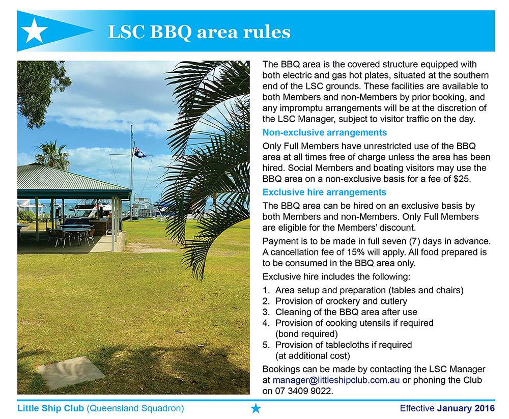 Please note:* Must be pre-booked by Members.** Mooring fee per full day or part thereof; subject to space availability.^ Members’ Security Tokens are for Full, Senior & Associate Members’ use only.*** Refunded on return of token minus $15 Services Fee.**** Cover charge or ticket price may apply to some events.@ Complimentary for Full Members, fees for Social Members and Visitors; please review LSC BBQ area rules. | ||