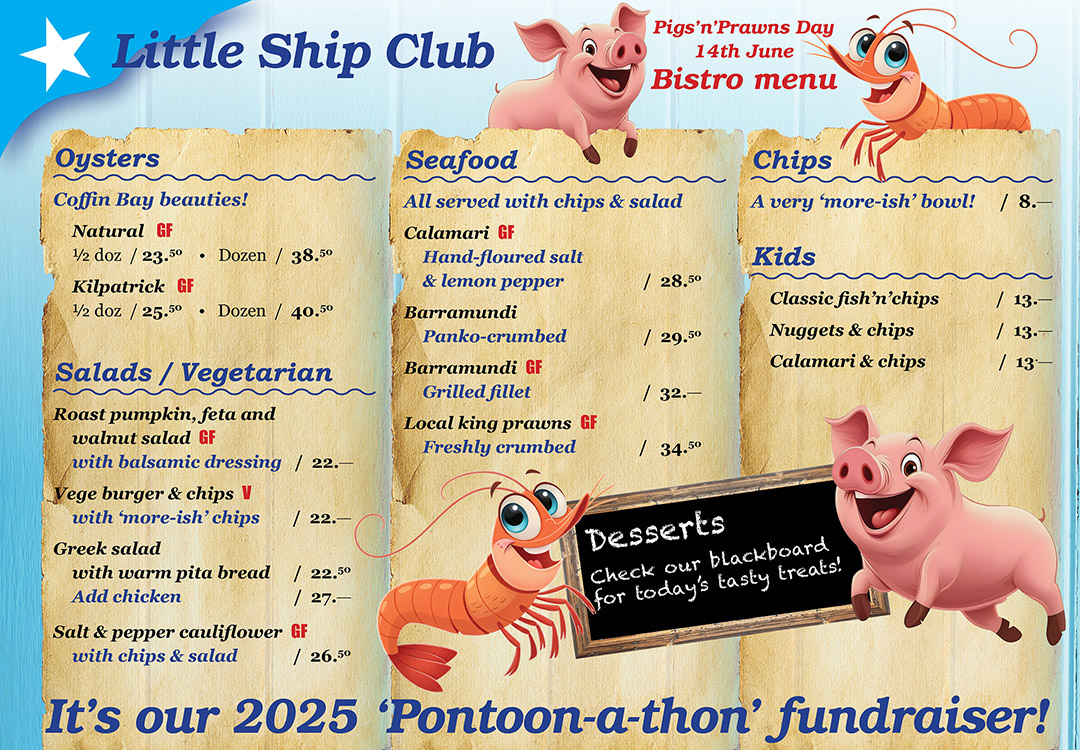 From 11am on Saturday, 14 June 2025, the beloved Pigs’n’Prawns Day returned to the Little Ship Club at the One Mile, Dunwich, raising funds to repair the Club’s damaged pontoon.